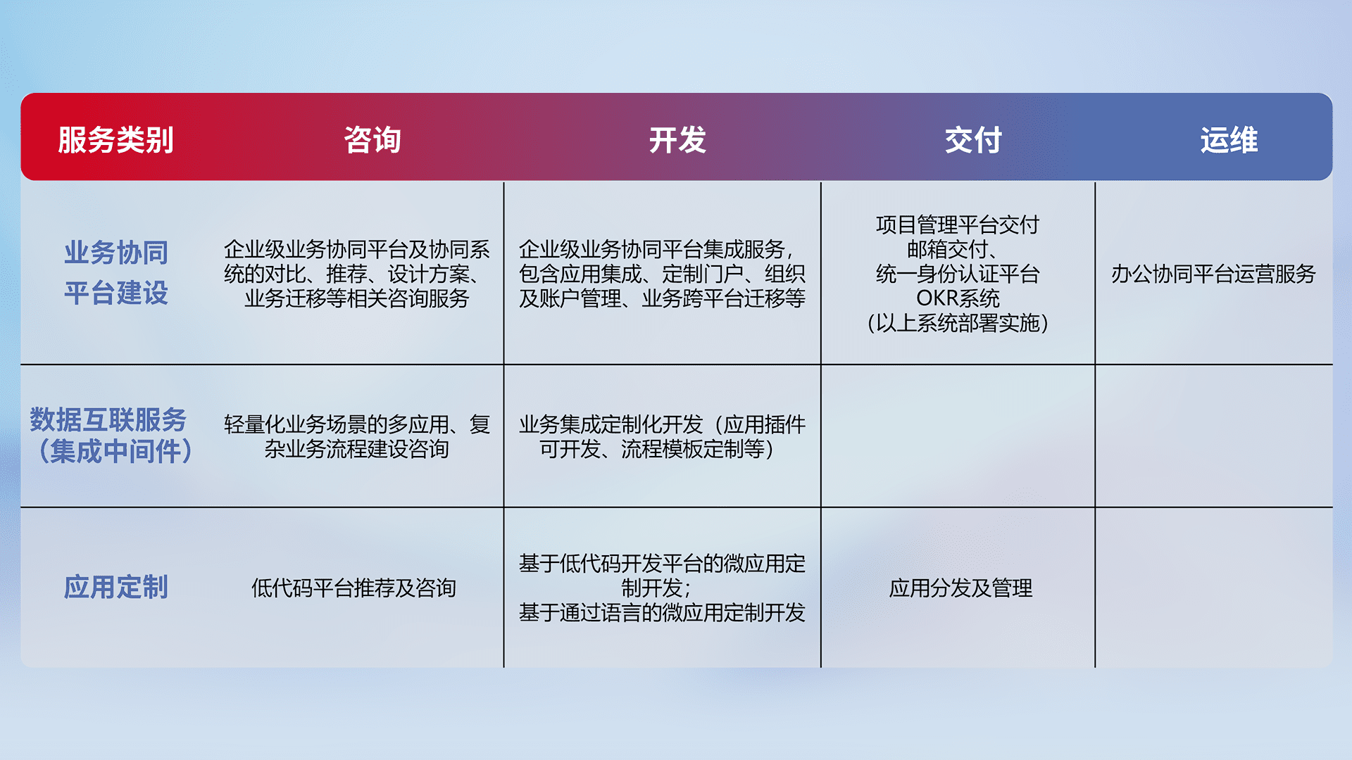 针对钉钉、、企微、、、、IDaas等平台级产品提供产品的规划、、、、方案、、、交付、、、定制化开发等服务,,,,实现如统一协同办公、、、、智能客户服务、、混合会议管理、、、智能数据查询、、、等业务场景,,,实现数字化转型。。
